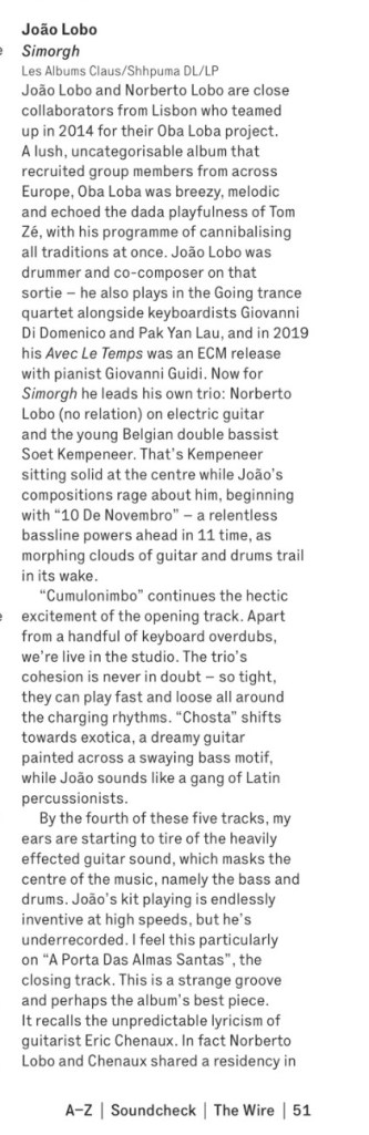 «[…] João Lobo continues to build an admirable career, with each record surprising us and needing to be heard. This “Simorgh”, close to jazz and experimental rock, with a spatial “groove”, is an excellent surprise. And how well the two Lobos play. They are exceptional cases in Portuguese music, with good techniques joining well-educated and non-conforming ears. » in Jazz.pt (PT) about « Simorgh »
